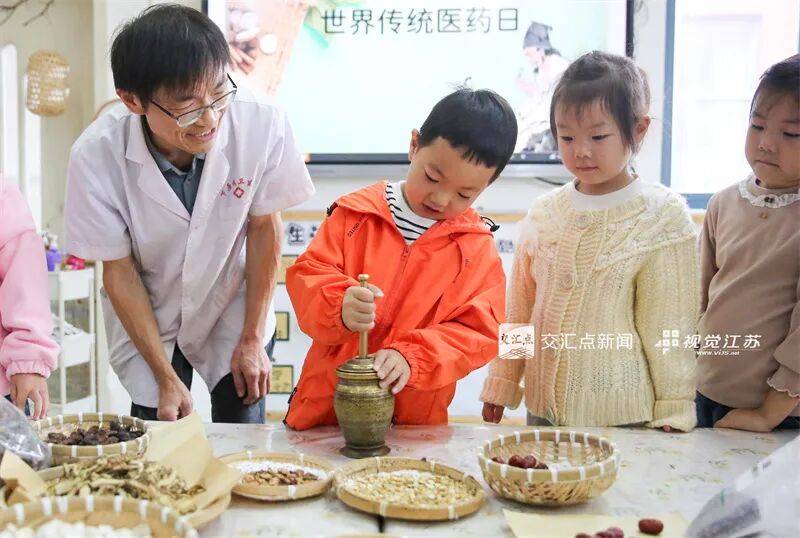 10月20日,如皋市下原镇下原幼儿园联合下原卫生院开展中医药知识学习活动。中药师带领孩子通过学习体验捣中药饮片等方式,学习中医药知识。徐慧 摄 视觉江苏网供图