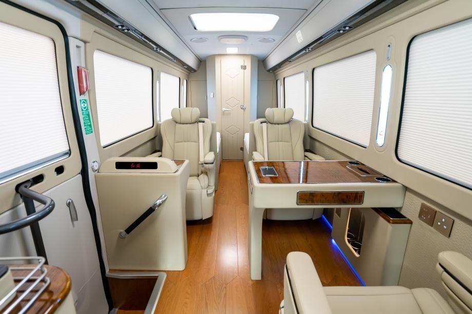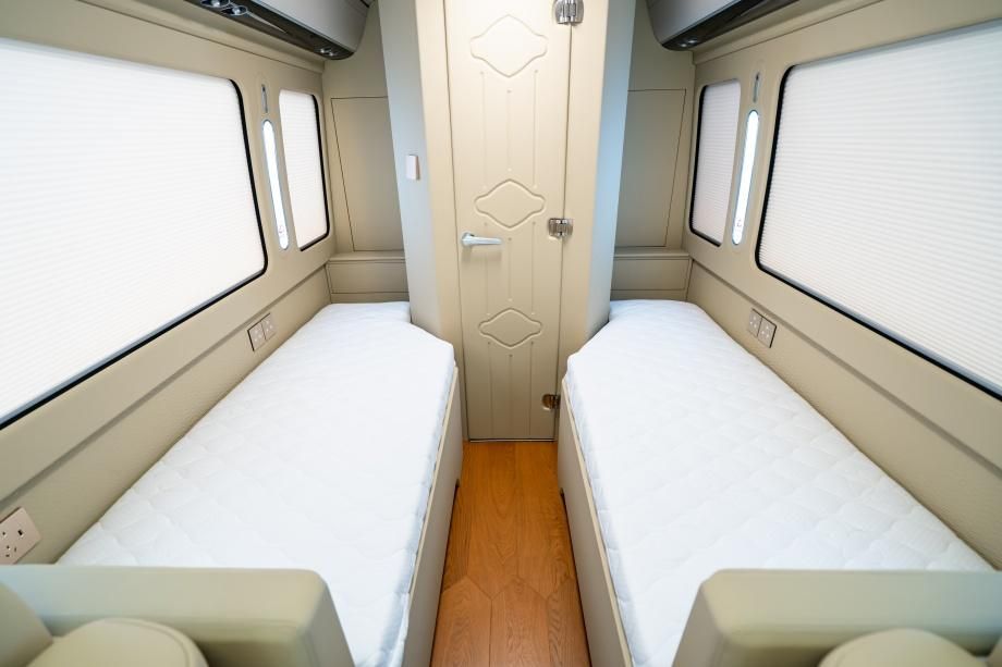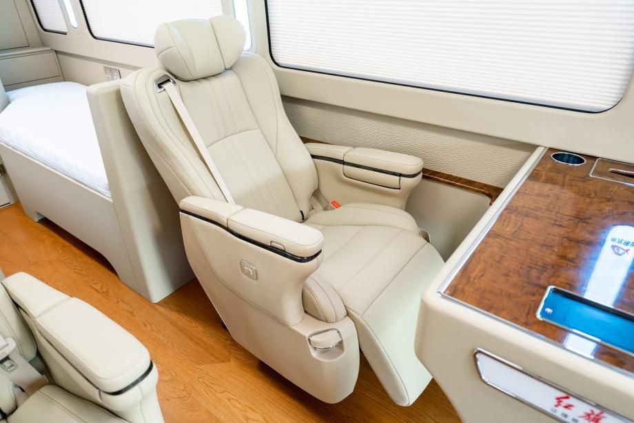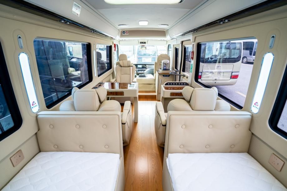 座舱后部设两张电动收纳定制单人床,展开后尺寸均为 1.9m×1.1m,配备 3cm 厚记忆棉床垫,躺下后腰部贴合度达 95%,中途休憩无腰酸感;不用时自动收纳至侧壁,厚度仅 10cm,不占用活动空间,灵活切换 “乘坐 - 休憩” 模式,适配跨省长途出行。