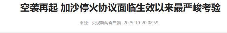 加沙局势也在持续恶化。10月20日,加沙城东部再次遭袭,导致至少4人死亡,5人受伤。民防部门表示,自10月10日停火协议生效以来,以色列军方已违反协议47次,造成38人死亡,数十人受伤。