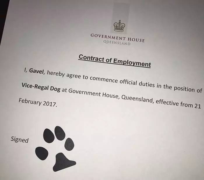 Gavel甚至还与办公室签署了雇佣合同(按了一个萌萌的小爪印),工作内容包括欢迎来访贵宾、参加典礼等。